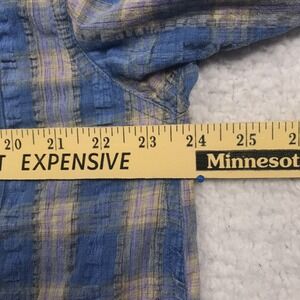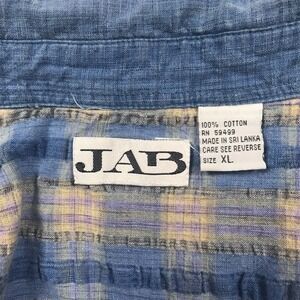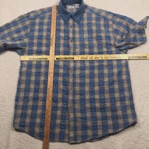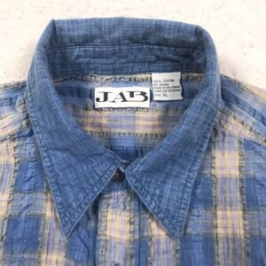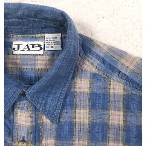 VTG 90s JAB Button Shirt Mens L Blue Tan Plaid SEERSUCKER Short Sleeve Casual ***Size Tag lists as XL, but measurements place it closer to Large -Please See Measurements in Photos to ensure desired fit***