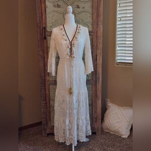This white lace dress is perfect for your boho or Beach wedding! Or bring out your inner Stevie Knicks with layering and accessories. Featuring hidden side zipper, intricate lace detailing, tassels, and a flattering silhouette, it offers both style and comfort. Looks super cute with cowboy boots and a wide brim hat!