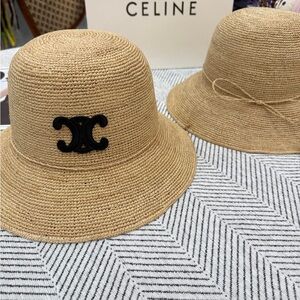 Elegant Celine hat in tan. Features a striking black emblem. Perfect for any occasion.