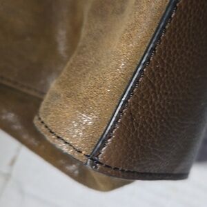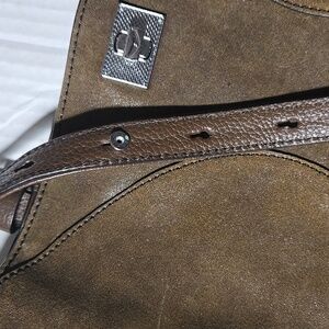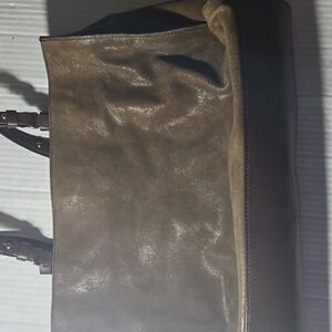 Beautiful chocolate brown suede has zip compartment and turnlock closer in good condition short trap brown all pieces are there long strap in good condition great bag