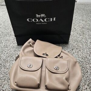 Elevate your everyday style with this sophisticated Coach backpack. Crafted in a beautiful neutral tone, this bag exudes understated elegance and practicality. The supple leather exterior is complemented by gleaming silver-tone hardware, including the signature Coach turn-lock closures on the flap and front pockets. The drawstring closure adds a touch of casual charm while ensuring your belongings are secure. Adjustable shoulder straps provide a comfortable, custom fit, and the thoughtfully designed interior offers ample space for your essentials. Imagine carrying this backpack on a weekend getaway, a stylish city excursion, or simply as a chic alternative to your everyday handbag.