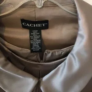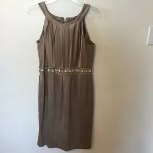 Elegant tan camel Cachet dress with matching jacket beautiful rhinestone and decorative embellishments on the jacket. Perfect for any occasion including mother of the bride, Holiday, party wherever you need a beautiful dress. measures approximately 18 inches under arm to under arm across the chest and approximately 32 inches under the arm to the bottom of the dress. Fabric is 97% polyester and 3% spandex. Worn once in excellent condition.