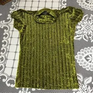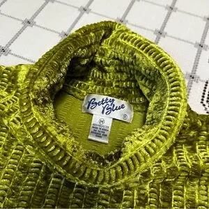 Retro glam lime green crushed velvet top by Betty Blue! Features a ribbed texture, slight stretch, short sleeves, and a cozy turtleneck. In great condition!