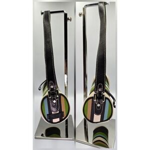 Keywords: Kate Spade, barrel bag, striped, shoulder bag, designer handbag, canvas bag, green, brown, boho, casual, everyday bag, small purse, zipper closure