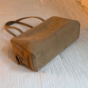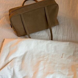 Soft bowling bag in soft nubuck leather with turned-edge construction, elongated flat handles, and smooth dual zipper closure. The natural grain surface is lightly buffed for a refined suede-like finish. Extremely soft and supple. Just like new has been worn twice!! Comes with original tag and a dust bag. In color Sand ANS.
