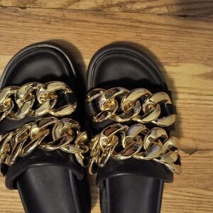 Stylish black slides featuring bold chunky gold chain accents. Perfect for casual wear and so very comfortable! look fashionable and cute and the best of all ways! I was influenced to buy these from a tick tocker and only wore them once! they look so adorable with black ankle pants or black wide leg trousers! if you are on your feet all day this is a cheat code to comfort! it's about a 1-in platform squishy sandal with firm base. only worn once!