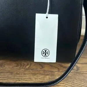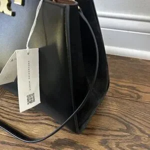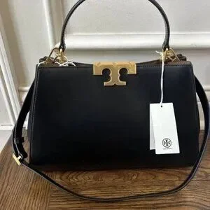 Stylish black satchel with gold accents. Perfect for any occasion.