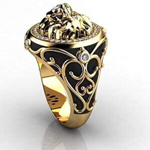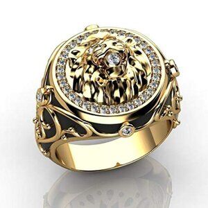 Gold Tone Lion Head Ring Men's Punk Viking Jewelry Iced Out Statement