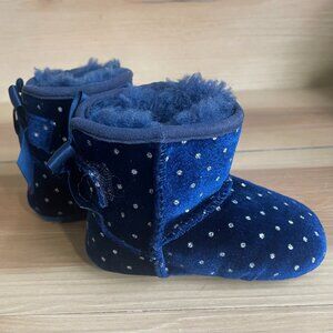 These are UGG's Jesse Bow Starry Lite infant boots in blue. The boots are made of metallic suede and feature a soft, plush wool lining to keep little feet warm. They are designed as a tiny version of the classic UGG boot style.