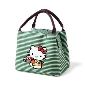 Stylish Hello Kitty Lunch Bag with green stripes. Perfect for everyday use. Insulated with a zipper closure.