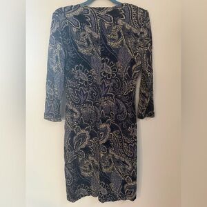Beautiful paisley print long-sleeve dress with a flattering V-neckline + ring-front gathering for a naturally slimming silhouette. Soft & stretchy fabric — comfortable, easy to wear, and perfect for work, dinner, or seasonal events. Dress up with heels or style with boots + tights for a cozy layered look.