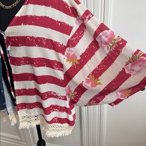 Elegant kimono with vibrant red, white and blue design. Perfect for a standout style.
