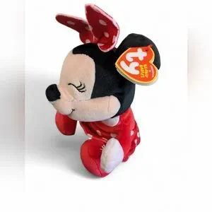 Adorable Minnie Mouse plush by Ty, measuring approximately 7.5 inches tall. Features Minnie’s classic red dress with white polka dots and matching bow.
