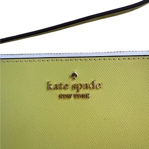 Authentic Kate Spade Lucy L-Zip wristlet in lime green saffiano leather. Perfect size for phone, cards, and essentials. Durable crosshatch leather with gold-tone logo. Clean interior, no rips or stains.