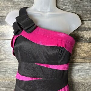 cocktail dress, party dress, evening bodycon, one shoulder dress, black pink dress, bandage style midi, Scarlett Nite size 6, holiday dress, date night dress