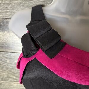 The mix of sultry bodycon fit and bold colorblocking makes this dress unforgettable. The one-shoulder bow adds feminine charm while the pink + black combo keeps it edgy. 💕🖤💕