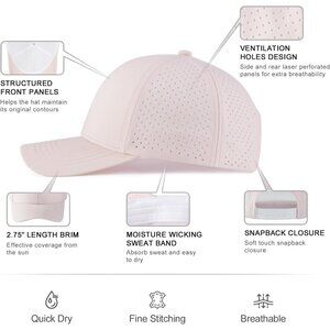 structured front panels, 6-panel cap, curved brim, laser-perforated side & rear panels for breath-ability, and soft touch snap-back closure.