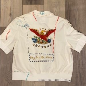 Hard to find. Very intricate and detailed Double D Ranch French Terry bomber jacket. Comfortable and easy wear. Women’s size small white.