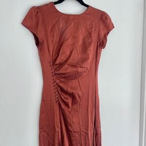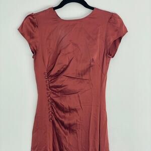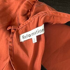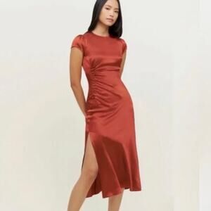 Reformation Tatianna midi dress crafted from luxurious silk in the rich Oxide colorway—a warm burnt red/orange tone. Designed with a classic crew neckline, cap sleeves, and a fluid silhouette that drapes beautifully on the body. Timeless, feminine, and perfect for weddings, dinners, vacations, or elevated everyday wear.