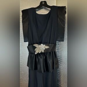 This elegant black vintage jumpsuit features a cute peplum, bedazzled belt, elastic waist, back buttons, and cool rectangular short sleeves. perfect for any special occasion.