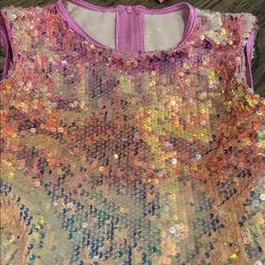 Dazzle in this vibrant sequin dress featuring a stunning rainbow of colors. Perfect for any festive occasion, this dress comes with a matching bow for added charm. Size 12 girls approximately based on size my daughter wore when she wore this.