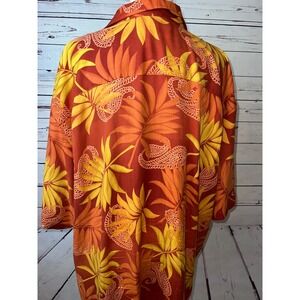Tommy Bahama USC Trojans Camp Shirt XXL Hawaiian 100% Silk Mens Button front, short sleeve 2X 2XL. Tropical with coconut buttons, embroidered University of Southern California USC Trojan spell out logo. One front pocket. Slit on each side. Machine washable. Made in China Pit to pit 29.5", back bottom of collar to bottom of shirt 32.25". Two extra buttons included. Great preowned condition with no rips or stains, possibly new and never worn. Perfect for the hawaii tropics vacation beach cruise college collegiate mom dad alumni coach aloha football game day championship so cal NCAA basketball. SoCal Colorful in orange and gold floral pattern throughout AOP all over print.
