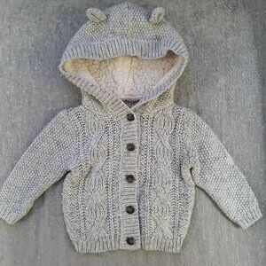 Gray Canadiana cable knit hooded baby cardigan with a sherpa lining and small bear ears on the hood.