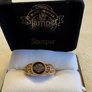 Stylish gold ring featuring Harley-Davidson emblem. Black enamel highlights. Ideal for fans.