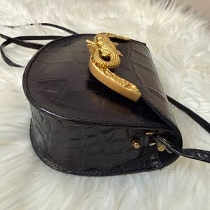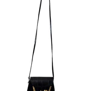 Elegant black croc-embossed crossbody bag by Ann Turk. Features a chic gold accent.