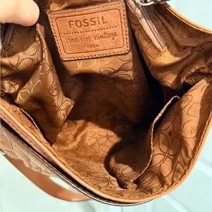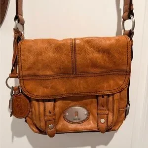 Elegant Fossil messenger bag in rich brown leather. Ideal for daily use. Features classic design and sturdy build.