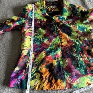 Add a bold statement piece to your wardrobe with this eye-catching vintage jacket! Featuring a vibrant abstract print in a mix of neon green, fiery orange, deep burgundy, magenta, teal, and black, this jacket is perfect for lovers of unique retro fashion. This blazer-style jacket showcases a stunning blend of deep greens and fiery oranges in an abstract, artistic pattern. Crafted from a smooth, satin-like fabric on the inside, it features a classic silhouette with structured shoulders and a front opening, making it a standout piece in any wardrobe. It is missing one Button on the left pocket.