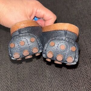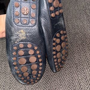 Elegant loafers with a black and brown leather design. Features signature Tory Burch emblem. Ideal for versatile styling.