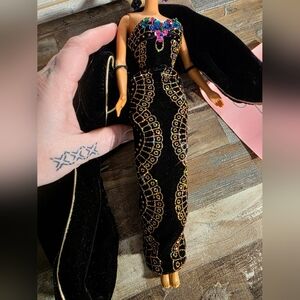 Elegant Barbie doll wearing a stunning black gown with gold accents. Features colorful earrings and a matching headpiece.