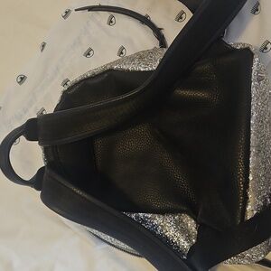 Sparkle with this eye-catching silver glitter backpack. Perfect for adding a playful touch to any outfit. Comes with dust bag. Back of backpack and straps are Italian leather.