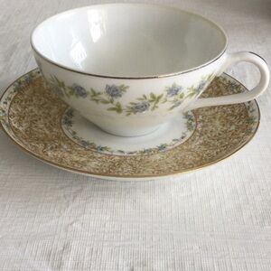 This elegant teacup and saucer set features a delicate floral design in white and gold. Perfect for adding a touch of sophistication to your dining experience.