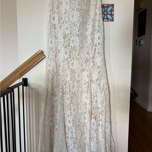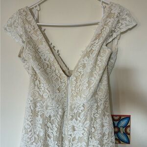 New with tags- beautiful Lulus wedding dress in Size Large with pretty gentle white/cream lace overlay. Fitted bodice with cap sleeves and elegant flowy skirt- perfect for twirling. Fully lined. Never worn- my sister decided on a different dress. Such a good find! white lace dress.