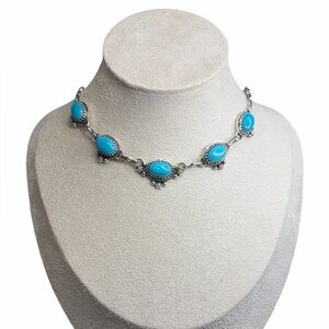 This artisan-handcrafted sterling silver necklace features genuine Kingman turquoise, known for its vibrant blue hues and classic Western appeal. Each stone is set in a closed-back design, showcasing beautiful craftsmanship and durability. Finished with an adjustable chain up to 16”, this piece offers a comfortable, close-to-the-neck fit, the PERFECT choker!
