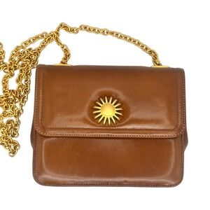 Vintage brown leather shoulder bag featuring a bold gold sun medallion and gold-tone chain strap. Structured silhouette with flap closure and interior zip pocket. Made in the USA with quality leather and classic statement hardware. Excellent condition with light interior wear consistent with age.
