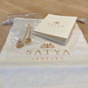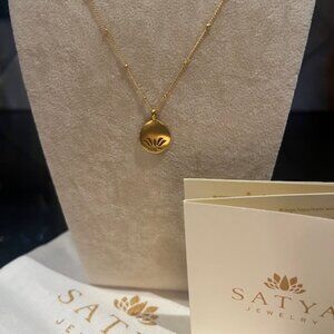 With each new dawn, the Universe blesses us with an opportunity to rise above our challenges and bloom freely and fully. An 18kt gold plate lotus flower, the symbol of new beginnings and full potential, creates a meaningful and inspiring pendant necklace. Pendant size is 15 x 13mm (not including bale). Necklace length is: 18 inches. 18k gold plate over brass. Satya signatures on chain clasp and back of pendant. New with original packaging as shown in photos.