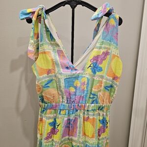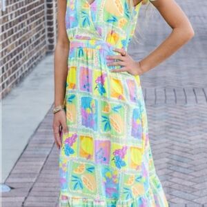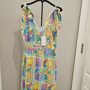 NWT Sadie & Sage Shoulder Tie Maxi Dress in spring mixed colors. The print has various fruits in the patchwork print. The waist has full elastic.