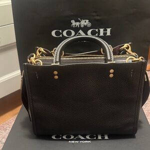 Elegant black leather bag. Features gold hardware. Includes shoulder strap and top handles. Iconic Coach tag attached.