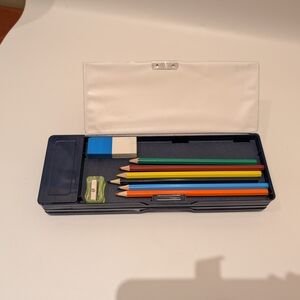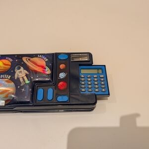 Blue pencil case with colorful space design. Very 80s 90s with lots of cool compartments and working calculator.