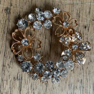 Gold-tone floral wreath brooch featuring clear crystal rhinestones. Excellent vintage condition.