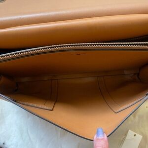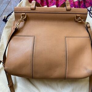Tory Burch Block-T Leather Satchel. This satchel is known for its luxurious minimalist design and features the subtle "T" shape integrated into the design through the top fold-over flap and front stitching.