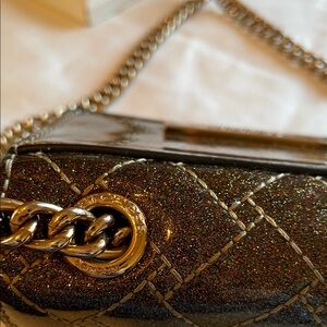 Add sparkle to your look with this Kurt Geiger clutch. Features a shimmering brown finish. Perfect for evening outings.You can carry this cross body or double the chain and carry on your arm .Great condition very clean ,the Eagle has colored gemstones ,snap closure .