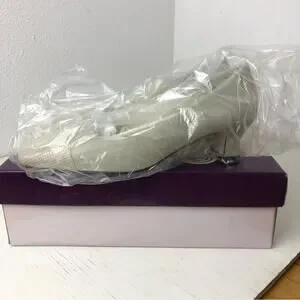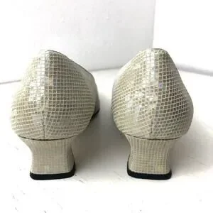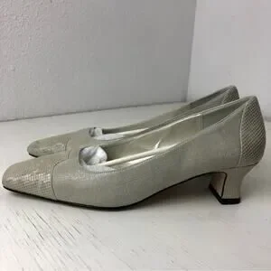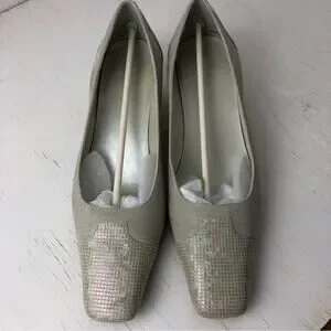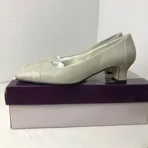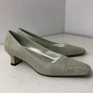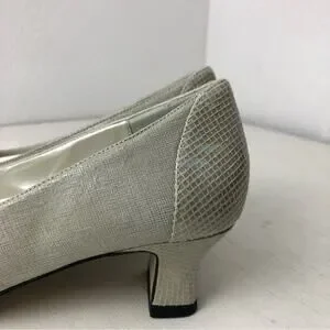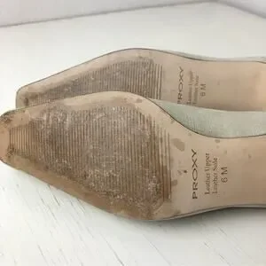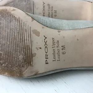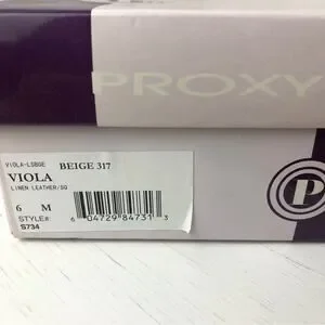 Proxy Viola neutral shoe, size 6. Linen and leather. Leather at toe and heel, has a slight iridescent appearance. Approx 1.5” kitten heel. Square toe. Worn once for a wedding, stored in original box. In excellent condition.