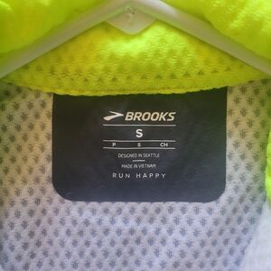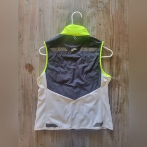 NWOT Brooks women's running vest with reflector pattern for safety. Features a sleek black and white pattern with neon yellow accents. Zippered hand pockets, fleece lined, full zip and snap enclosure for extra warmth. Never worn.