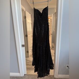Dazzle in this Sherri Hill strapless gown. Black sequins and feather detail create a glamorous look.
