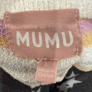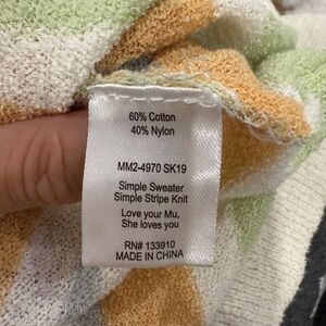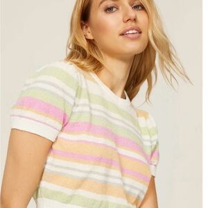 Soft knit top with pastel stripes. Features pink, lavender, and yellow accents.