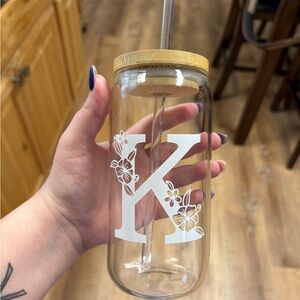 Clear glass tumbler with a bamboo lid and straw. Features a white floral 'K' design.